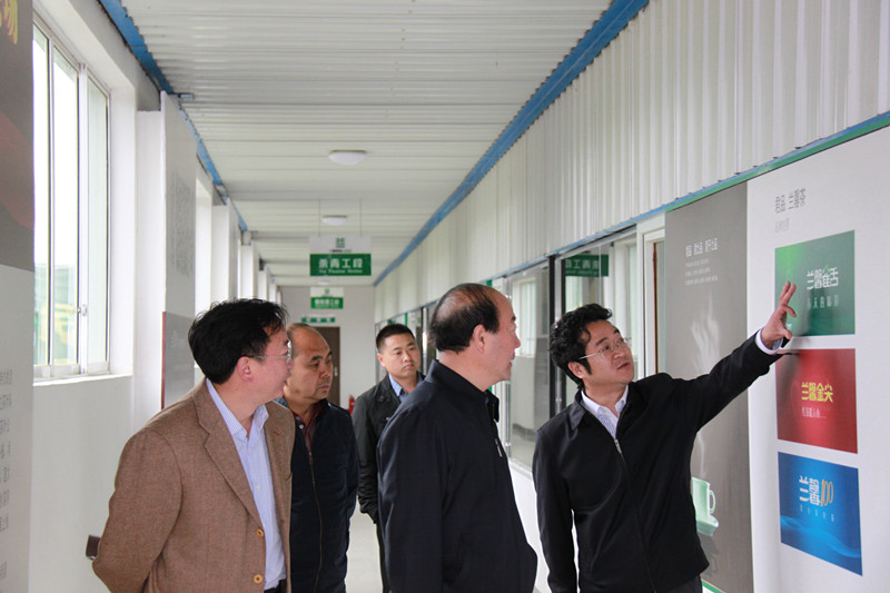 5月2日,蘭馨生產車間參觀走廊。金循正向傅傳耀(中)介紹公司產品體系以及品牌發展情況。