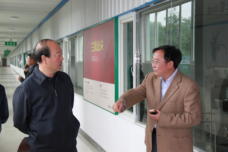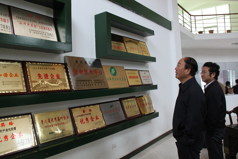 傅傳耀與湄潭縣委書記魏在平(右)在公司參觀走廊交談。