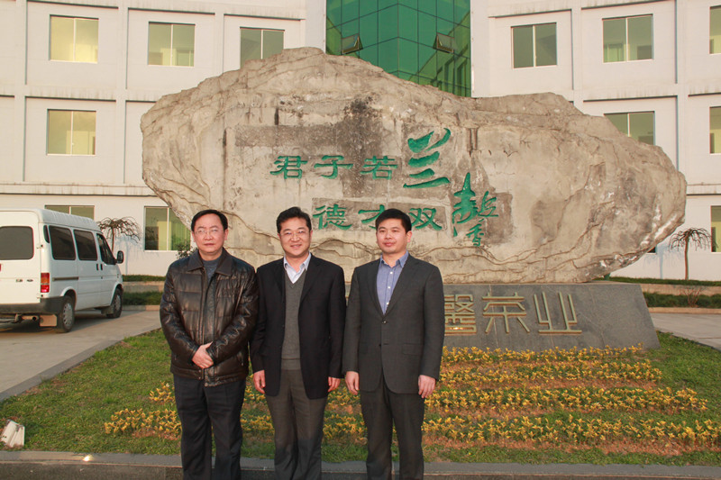 縣委書記魏在平(右)、縣長李勰(中)、副縣長向波(左)在公司大廳討論“蘭馨100”珠形茶。