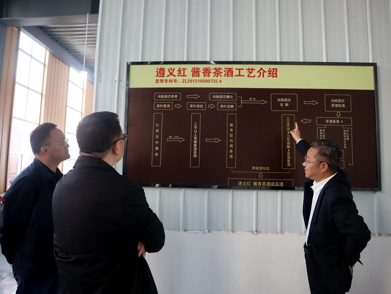 在董事長金循陪同下,調研組一行走進公司精制車間、包裝車間、文化展示廳、圣心茶酒廠參觀考察。