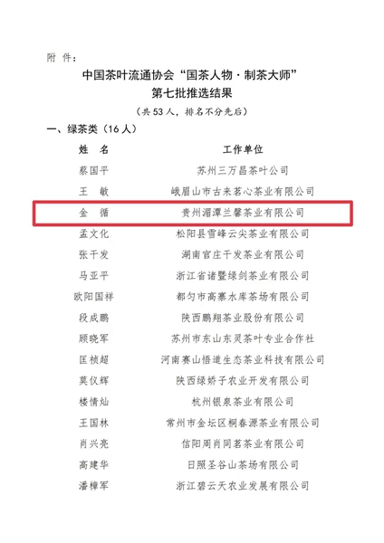 11月18日,中國茶葉流通協會公布“國茶人物·制茶大師”第七批推選名單,貴州湄潭蘭馨茶業有限公司董事長金循榮耀上榜,獲中國綠茶制茶大師稱號(文末附獲獎名單)。