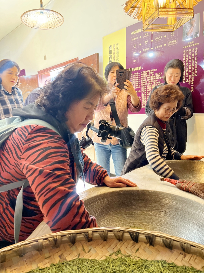 在莊園的手(shou)(shou)工(gong)制(zhi)茶(cha)(cha)(cha)坊(fang),一(yi)陣濃濃的茶(cha)(cha)(cha)香撲面而來。鐵(tie)鍋(guo)深(shen)灶,文火翻炒(chao),一(yi)顆(ke)顆(ke)茶(cha)(cha)(cha)芽在制(zhi)茶(cha)(cha)(cha)大師(shi)張澤旻的巧手(shou)(shou)中片片飛(fei)起,又(you)片片落下,頃(qing)刻間翻炒(chao)出一(yi)室茶(cha)(cha)(cha)香。看(kan)到如此有意思的畫面,韓國(guo)研學團(tuan)客(ke)人們(men)躍躍欲試,在制(zhi)茶(cha)(cha)(cha)師(shi)傅的指(zhi)導下,一(yi)一(yi)上手(shou)(shou)嘗試,親身體驗制(zhi)茶(cha)(cha)(cha)樂趣,感(gan)受傳統(tong)手(shou)(shou)工(gong)藝文化。