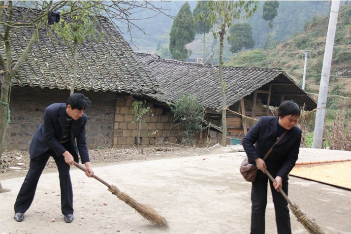 圖:11月21日,蘭馨茶業有限公司質管部經理張澤旻(左)和生產部經理徐才梅(右)在困難戶劉云菊家中幫助打掃院壩。