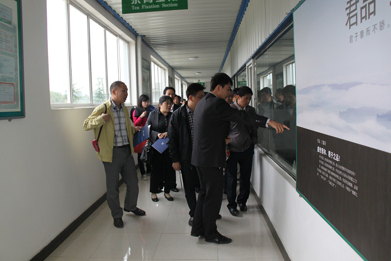 圖:公司工作人員正向巴南區客人介紹公司名優茶生產線。該名優茶生產線由公司投資5600多萬元建成,徹底實現了高端名優綠茶的標準化、清潔化、規模化生產。