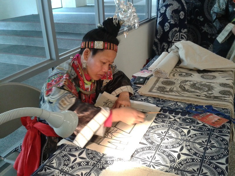 圖:活動現場,一名來自貴州的苗族婦女正在演示傳統的蠟染工藝