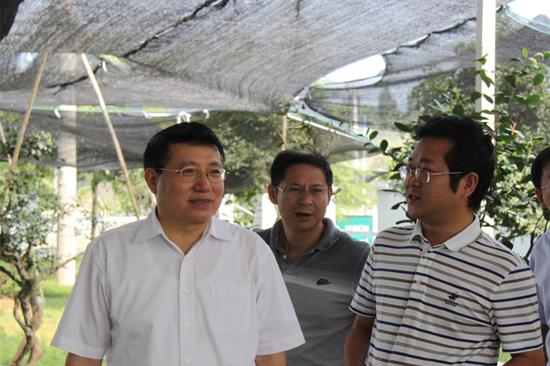 9月16日,在蘭馨古茶樹園內,公司總經理金循(右)正在向遵義市市長王秉清(左)介紹古茶樹資源鑒選、保護和利用等工作的開展情況。