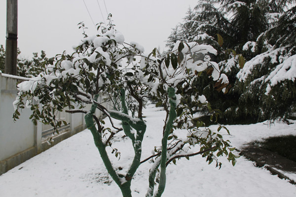 轉角處的桃樹也掛滿銀枝