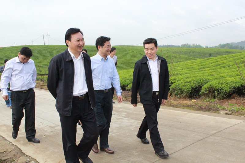 金循(前中)陪同姜世甫副書記(右一)、陳華副市長(左一)一行在永興萬畝茶海考察湄潭茶葉基地建設情況