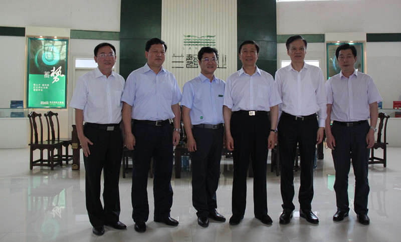 國家副主席李源潮(右三),中共貴州省委副書記、省長陳敏爾(右二),貴州省委秘書長廖國勛(右一),省委常委、遵義市委書記王曉光(左二),湄潭縣委書記魏在平(左一),公司董事長金循(左三)在大廳拍照留影。