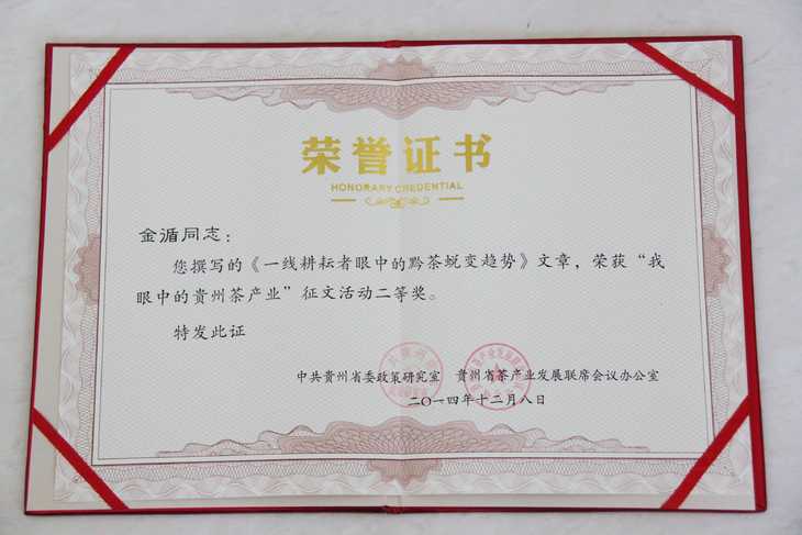 蘭馨茶業董事長金循的文章《一線耕耘者眼中的黔茶蛻變趨勢》在此次征文活動中榮獲二等獎。文章主要從茶園的治理模式和中小微型茶企的未來發展方向兩個方面對貴州茶產業進行闡述。通過參加“我眼中的貴州茶產業”征文活動并獲得二等獎,不僅提升了蘭馨茶葉在貴州茶產業中的社會地位,也使蘭馨茶葉深刻認識到要推動貴州茶產業的發展,不僅僅需要政府的支持,更需要茶企的共同努力,將茶企擰成一股繩,團結一致,才能更好更快的促進貴州茶產業的快速發展。