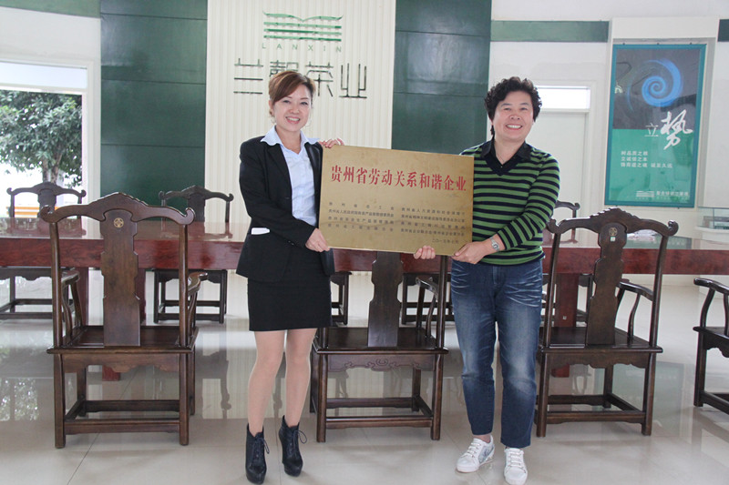 2015年9月,蘭馨茶業榮獲“貴州省勞動關系和諧企業”表彰,湄潭縣總工會工會主席張祖玲親臨蘭馨公司授牌。