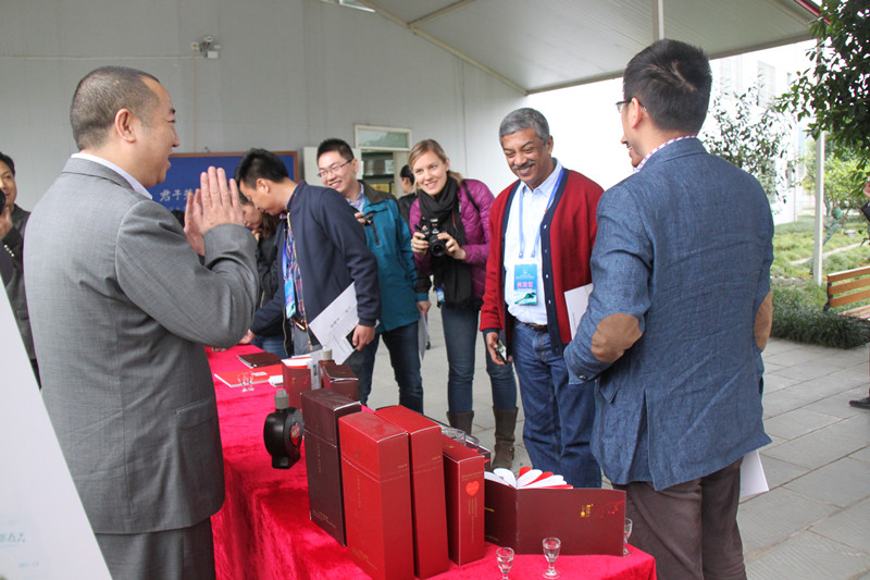 國外客商駐足公司“點犀”紅茶酒展臺前察看茶酒系列產品,喜笑顏開。(“點犀”品牌來源對古詩“身無彩鳳雙飛翼,心有靈犀一點通”的感悟)。