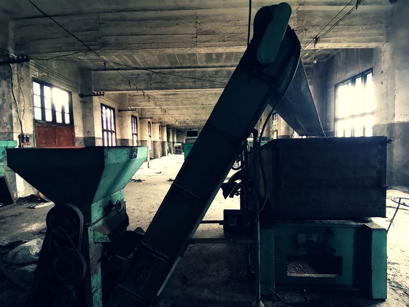布滿青苔的地面,銹跡斑駁的樓梯扶手,脫落的墻頭,還隱隱可見曾有燕子筑巢的痕跡。屋里偶有陽光,陳舊的機器交錯雜陳。