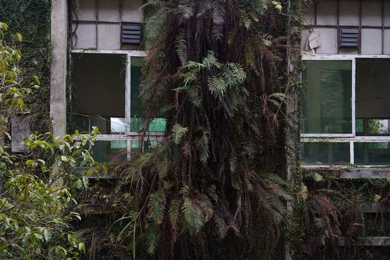 窗臺幾乎被綠藤籠罩,牽藤引蔓、穿石繞檐、努力生長。只留下幾個黑洞洞的窗戶,詫異地打量著這個安靜的世界。
