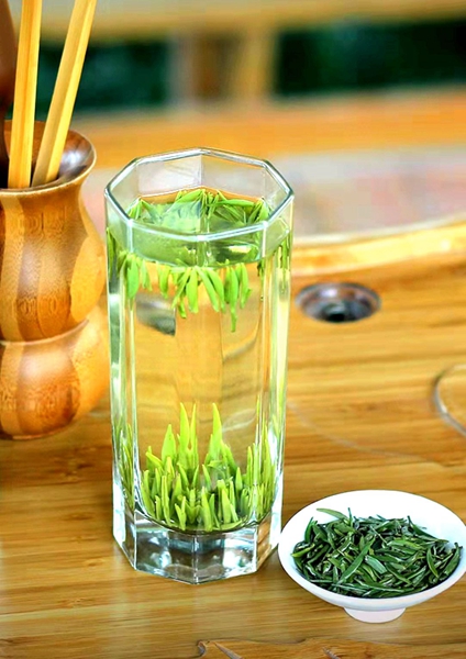 蘭馨雀舌是典型的芽茶,摘取茶樹梢上的獨芽加工而成,葉片飽滿、嫩綠、勻整。沖泡時亭亭玉立,續水時上下翻飛,三落三起,唯美大氣。立得起,沉得下,展得開,被稱作“在舌尖舞蹈的春芽”!