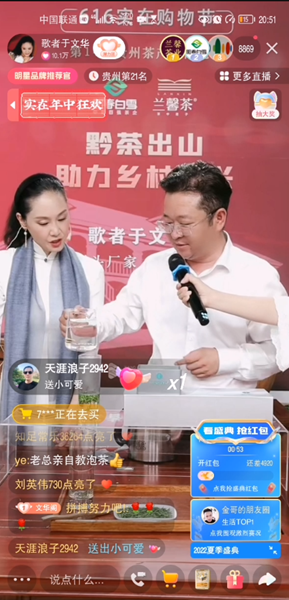 16日,在快手“歌者于文華”直播間里,蘭馨茶業攜手于文華、西南民族大學博士生導師、研究員、“網紅縣長”陳燦平開啟茶葉專場直播,向全國網友推介蘭馨茶。