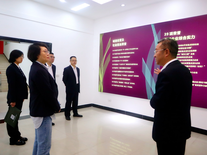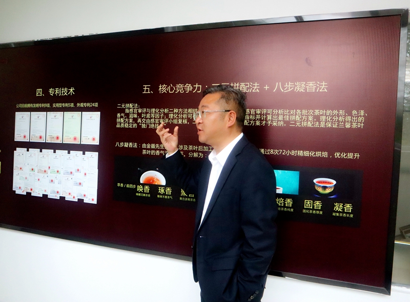 在董事長金循陪同下,調研組一行走進公司精制車間、包裝車間、文化展示廳、產品展示廳、圣心茶酒廠,金循詳細介紹了蘭馨茶業發展歷程、經營現狀、品牌矩陣、茶葉及茶酒工藝等情況。